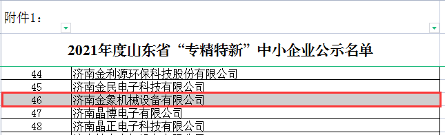 根據(jù)《山東省“專精特新”中小企業(yè)認(rèn)定管理辦法》(魯工信發(fā)〔2020〕7號)、《關(guān)于組織推薦第三批專精特新“小巨人”企業(yè)和開展2021年度山東省“專精特新” 中小企業(yè)培育認(rèn)定工作的通知》等文件精神,省工業(yè)和信息化廳組織開展了2021年度省“專精特新”中小企業(yè)培育認(rèn)定工作。經(jīng)嚴(yán)格審查,濟(jì)南金象機(jī)械設(shè)備有限公司順利通過2021年度省市兩級“專精特新”企業(yè)評審,成為2021年度山東省和濟(jì)南市“專精特新”企業(yè)。